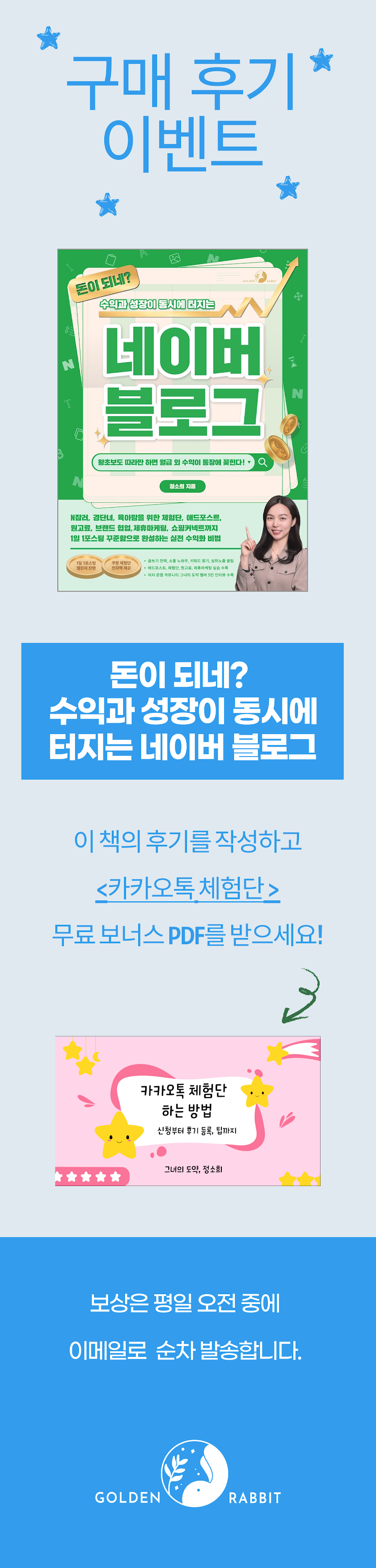- 개요방법1. 스레드/블로그/인스타/유튜브 등 SNS에 정성 후기 업로드2. 키워드 (#내돈내산 #책추천 #골든래빗 등)3. 이 글에 후기 링크를 입력하여 참여!리워드 안내1. 리워드 : 카카오톡 체험단 전자책2. 지급 : 평일 기준 오전 중에 이메일로 전송