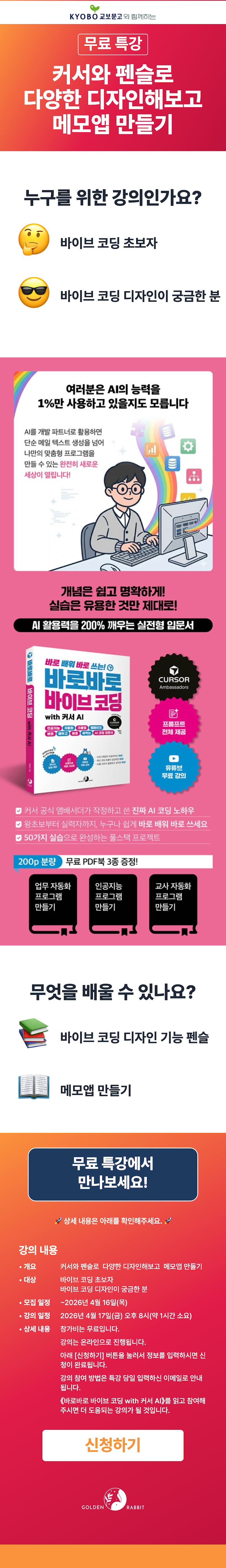 '바이브 코딩'은 단순히 기술적인 스킬을 넘어, 코딩을 즐기고 몰입하는 과정에서 느껴지는 긍정적인 감정과 경험을 중시하는 코딩 스타일을 의미합니다. 이 책에서는 생산성을 극대화하는 커서 기반 코딩을 통해 코딩 과정 자체를 즐겁게 만들고, 자신만의 리듬과 흐름을 타면서 코딩할 수 있도록 안내합니다. 바이브 코딩은 효율적인 도구 사용, 지속적인 학습, 그리고 긍정적인 마음가짐을 통해 완성됩니다. 바이브 코딩은 특정 프로그래밍 언어나 기술에 국한되지 않고, 모든 개발자가 자신의 상황과 선호도에 맞게 적용할 수 있는 코딩 철학입니다. 이 책 《바로바로 바이브 코딩 with 커서》는 커서 기반 코딩이라는 강력한 도구를 통해 바이브 코딩을 실현하는 방법을 제시하며, 독자들이 코딩을 더욱 즐겁고 의미 있는 경험으로 만들 수 있도록 돕습니다. 바이브 코딩으로 코딩 역량을 한 단계 업그레이드 해보세요!